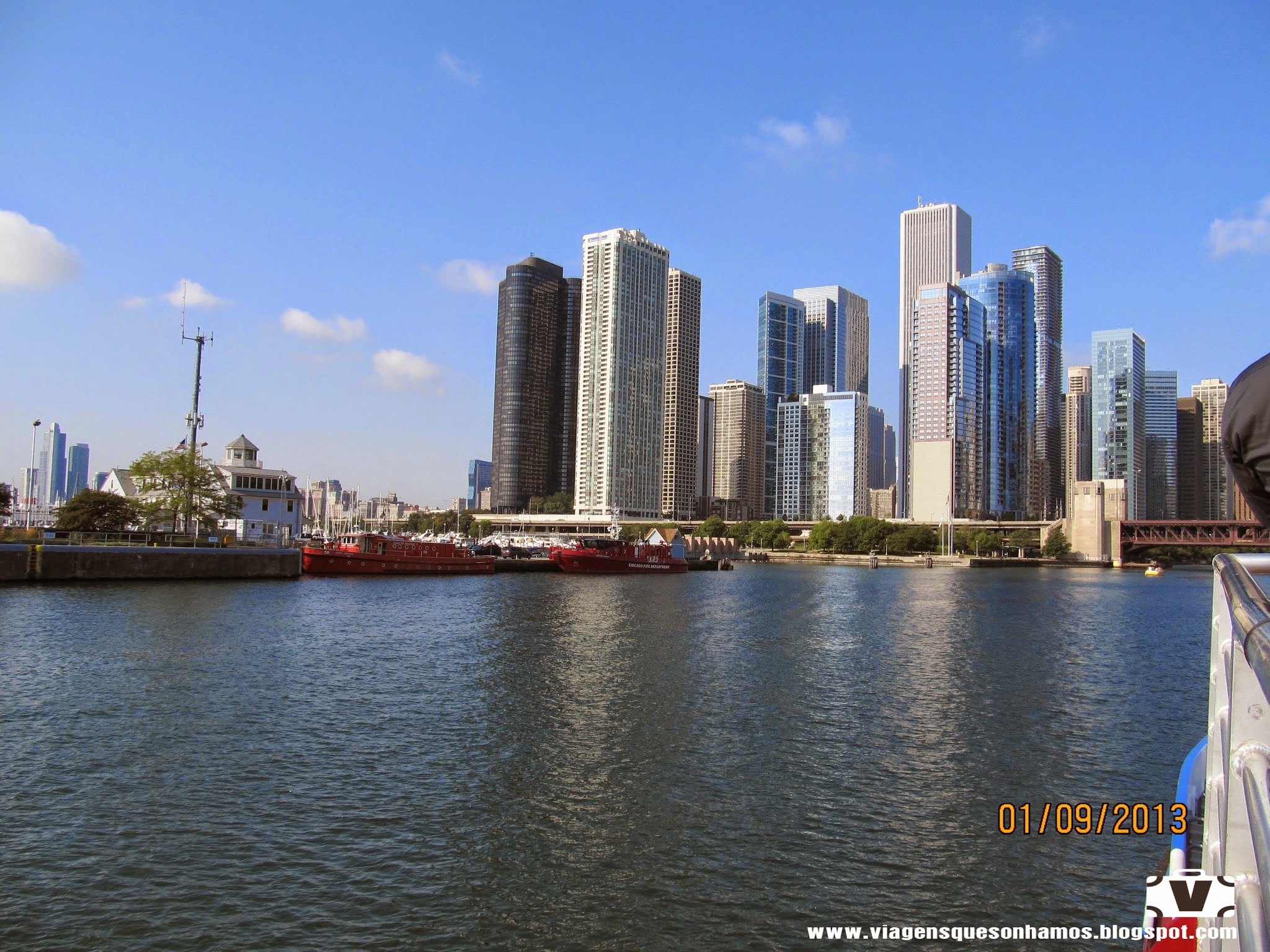 Existem duas formas de passear por Chicago, curtindo o skyline da cidade: passeando pelo River BoarderWalk, curtindo uma parte do Chicago River, ou fazendo um passeio de barco pelo rio. Nós fizemos os dois. A caminhada pela beira do rio é bem agradável, com muitos jardins, fontes de água e monumentos. Mas é num passeio de barco, que podemos aproveitar a grandiosidade da arquitetura de Chicago.