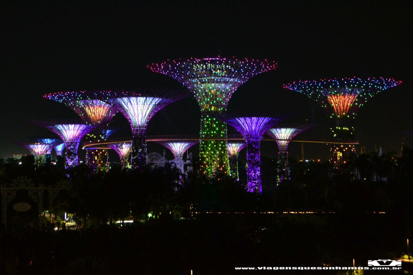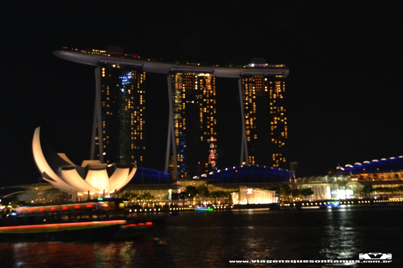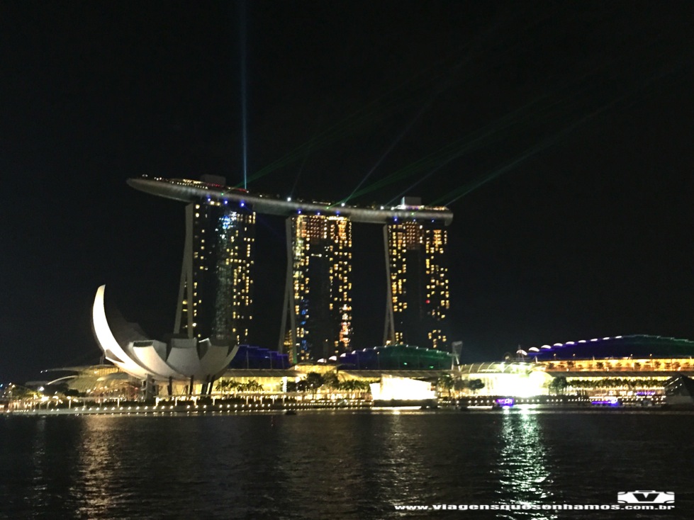 Descansamos um pouco e saímos pelas 19h, caminhando em direção ao The Esplanade, local com teatros e linda área externa de frente ao rio e de frente ao Marina Bay Sands, para assistir ao show noturno de luzes que acontece diariamente às 20h e também às 21h30min. O show não tem nada de muito interessante, mas ver a cidade iluminada é muito bonito. Eu queria ver também as Supertrees iluminadas. Então fizemos o caminho contrário que havíamos feito durante a tarde: atravessamos a Helix Bridge, o shopping e o Marina Bay Sands. Logo após passar o hotel, tem uma passarela que liga ao Gardens By The Bay e foi de lá que assistimos ao show de luzes do Gardens By The Bay, na minha opinião mais bonito que o do Marina Bay Sands. Esse show acontece diariamente às 19h45min e às 20h45min. Então da tempo de assistir aos dois shows no mesmo dia. Já podre de cansados, voltamos de trem para o hotel. E na manhã seguinte partiríamos para Bali.