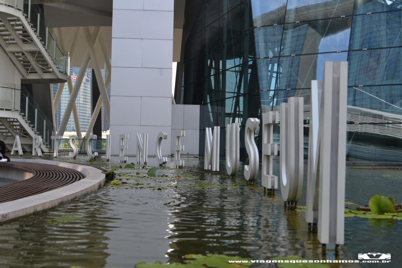 Saímos do Gardens By The Bay e fomos para o hotel Marina Bay Sands. Desisti de subir até a piscina, pois não daria tempo para conhecer tudo o que queríamos na cidade e não estávamos a fim de investir $$ para apreciar a vista. Na próxima vez eu me hospedarei no hotel e vou aproveitar a piscina. Passamos pela área social do hotel e seguimos em direção ao shopping do mesmo complexo, onde há muitas lojas de grifes e cassino. Em frente ao shopping fica o ArtScience Museum.